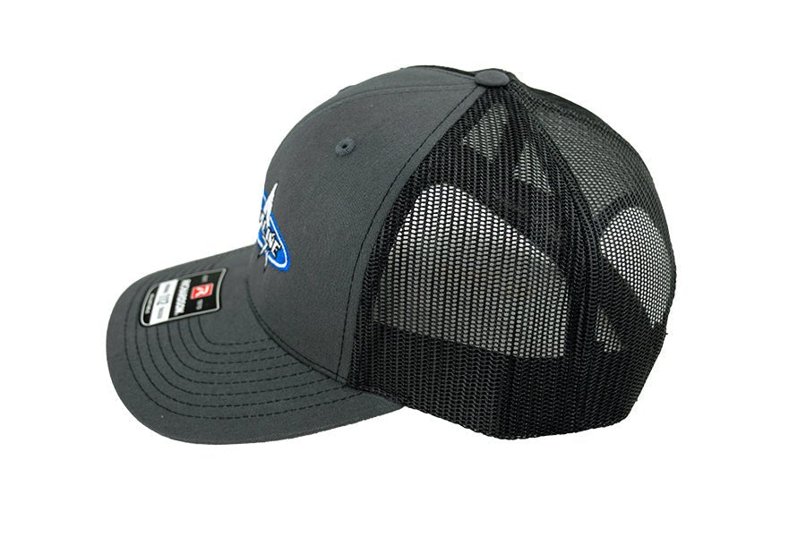 Adrenaline Trucker Hat made from the famous Richardson 112. It is a charcoal grey base with black mesh rear and black piping.